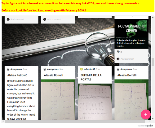Per Safer Internet Day, il 06/02/2018 hanno partecipato in una videoconferenza con le scuole partner (ndr: articolo su Safer Internet Day). Inoltre si sono addestrati a creare password più sicuri partendo da quelli meno sicuri attraverso la crittografia: