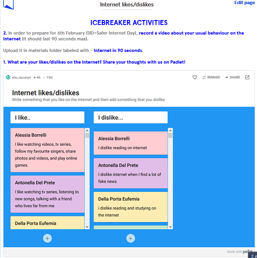 Gli allievi si sono presentati, hanno comunicato, interagito, commentato e finalmente ricercato attraverso la lingua franca del progetto, l’inglese. Si sono anche buttati capofitto nell’eseguire attività attraverso le TIC e quindi oltre alle competenze in inglese, hanno acquisito anche competenze digitali. Si sono presentati in modo inconsueto: quello che gli piaceva e non della rete (Padlet) e un video di 90 secondi delle loro abitudini per ciò che riguarda i siti visitati e le attività tipiche online.